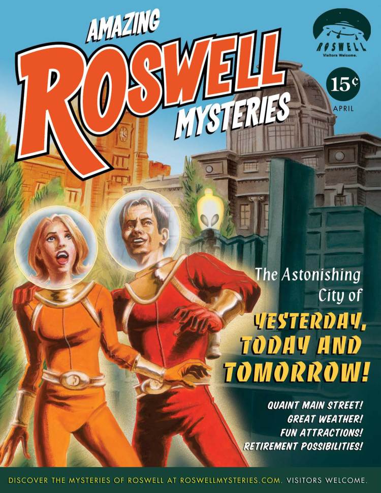 Here’s the first of the Roswell illustrations in the series. I am posting it third, I don’t know why. This time the featured attatraction is city of Roswell itself, which feels like a small American town from the 1940’s. The street lamps are really decorated with alien eyes. I didn’t see any spacemen there, though. Enjoy!
