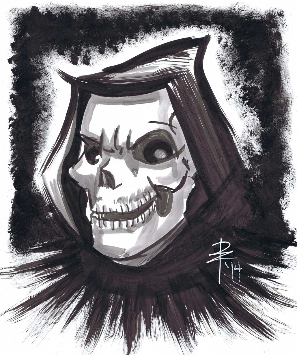 While I was warming up to do a caricature demonstrate at the Albuquerque Rail Yards Market, I drew this guy. I was using Yasutomo sumi ink and watercolor brushes on the 14in x 17in Pentalic “Paper for Pens”. When I was nine years old, I loved drawing the grim reaper! It’s time to get back to my roots.
