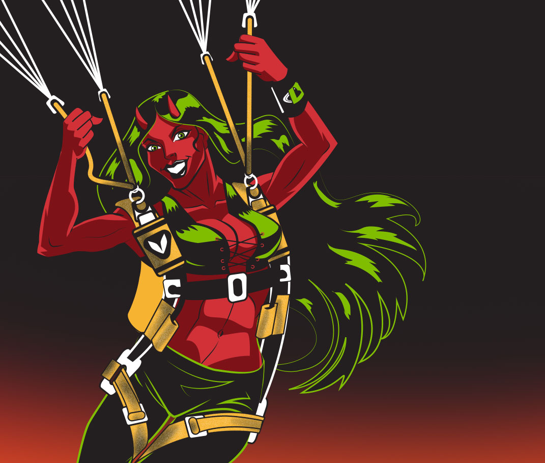 She’s back! This time, Sky Dive Arizona’s mascot is steering her canopy through the flames of hell! Vectorized illustration executed in Adobe Illustrator with flourishes in Adobe Photoshop.